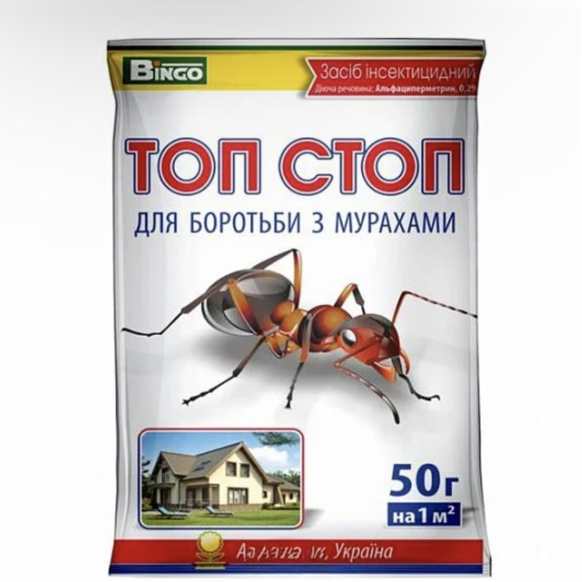 Топ Стоп — високоефективний контактно-шлунковий інсектицид у формі порошку, призначений для швидкого знищення всіх видів мурах та інших побутових комах у житлових, підсобних та складських приміщеннях. Препарат забезпечує тривалий захисний бар'єр, перешкоджаючи повторній появі шкідників.