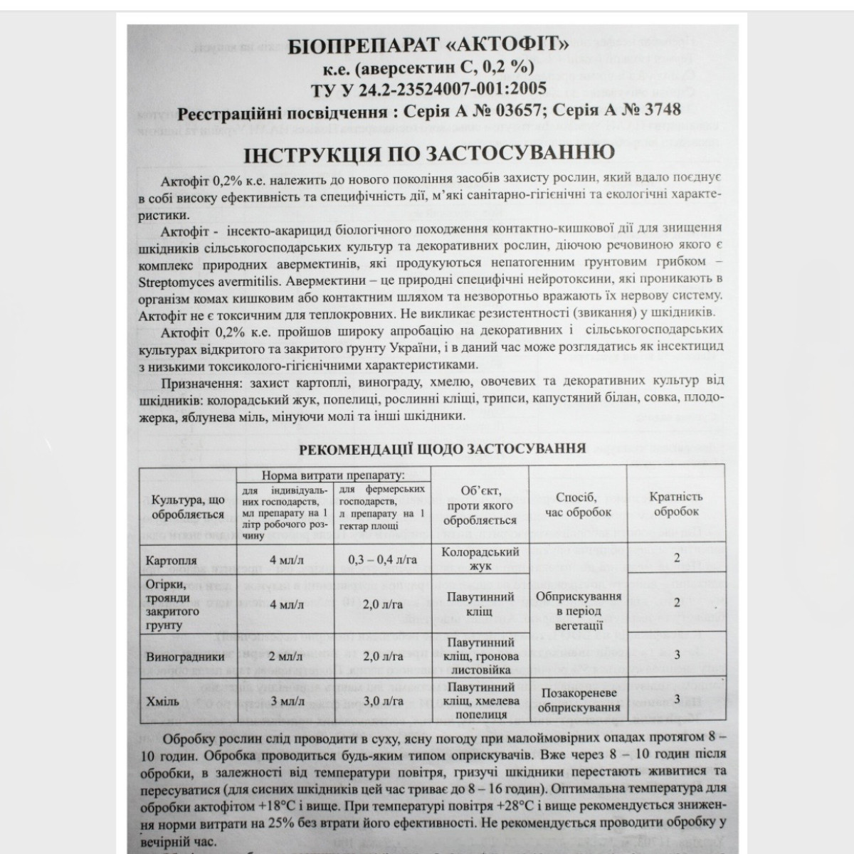 Актофіт — це високоефективний препарат біологічного походження (біоінсектицид та акарицид), призначений для боротьби зі шкідниками овочевих, плодових, ягідних, декоративних культур та кімнатних рослин. Засіб ефективний як у відкритому ґрунті, так і в теплицях.