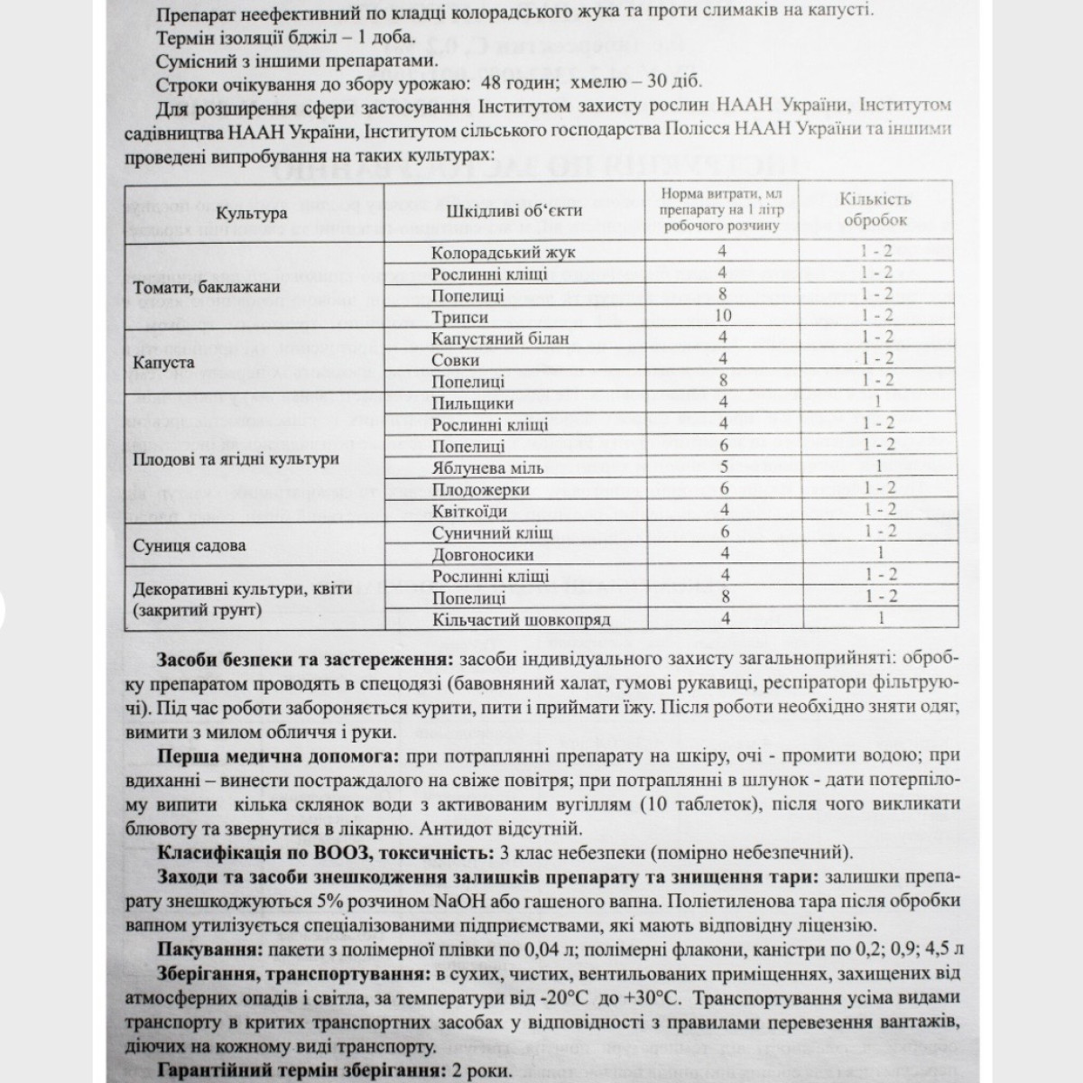 Спектр дії: Колорадський жук, попелиці, трипси, капустяний білан, совки, плодожерки, павутинний кліщ, рослиноїдні кліщі, пильщики.